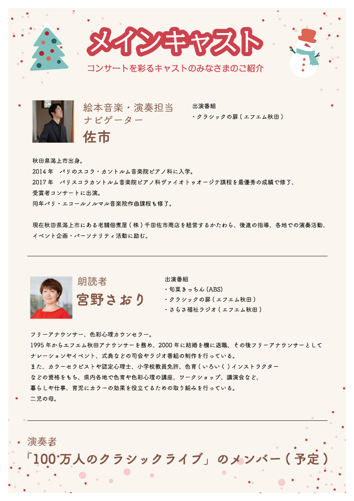 出演:佐市(ナビゲーター)、宮野さおり(絵本朗読)、演奏者「100万人のクラシックライブ」メンバー(未定)